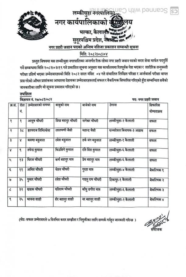 नगर प्रहरी जवान पदको अन्तिम नतिजा प्रकाशन सम्बन्धी सूचना ।