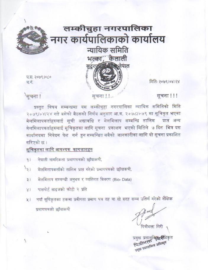 मेलमिलापकर्ताहरु सूचिकृत हुने सम्बन्धी सूचना ।